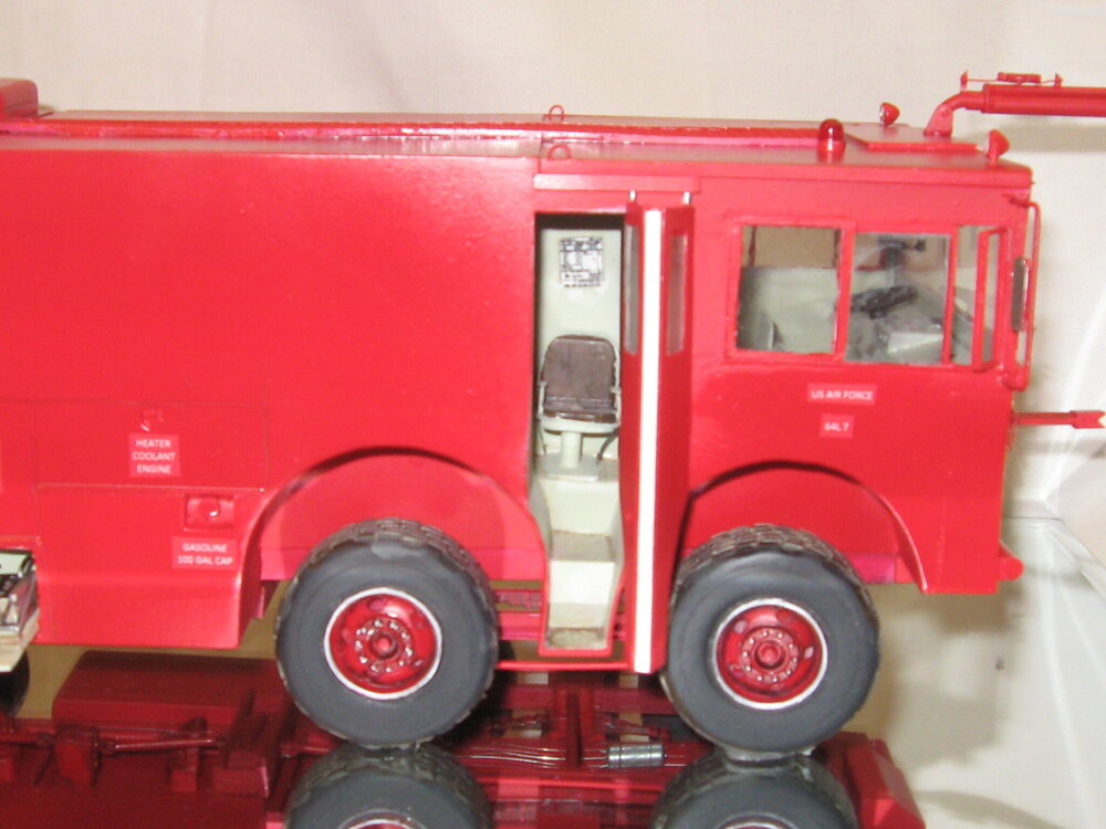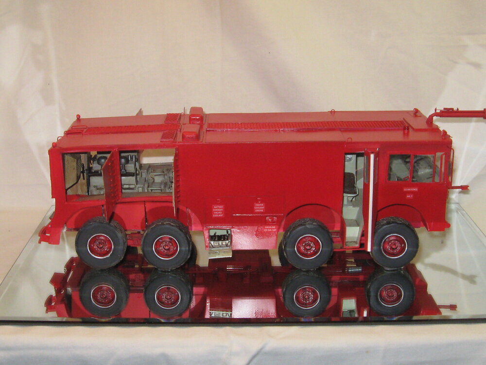 Attached are photographs of my 1 1/2 year scratch build 1/25 scale P-2 crash fire truck. Length is approximately 16 inches. Wheels and tires are custom bought from American Industrial Truck Models out of New Jersey, seats are from an American LaFrance ladder truck, engines were bought on E Bay and are modified to look like the earlier gasoline engines, and a couple of transmission parts from a Russian truck. The rest is sheet styrene and tubing.