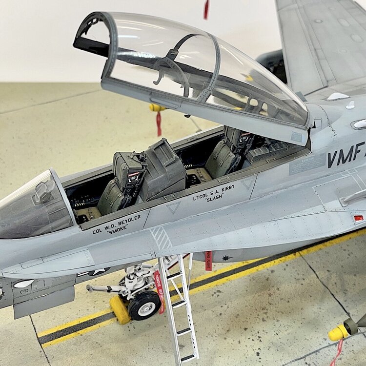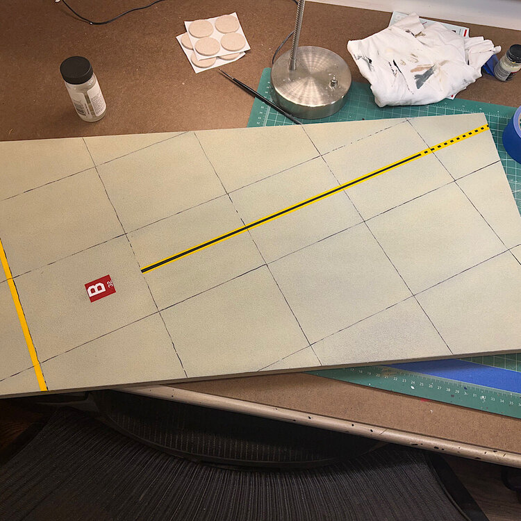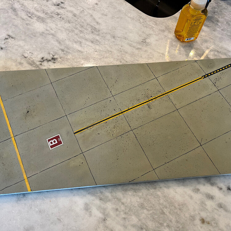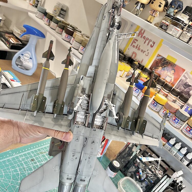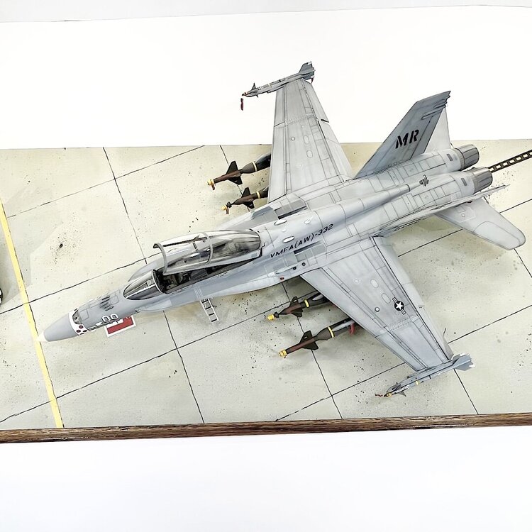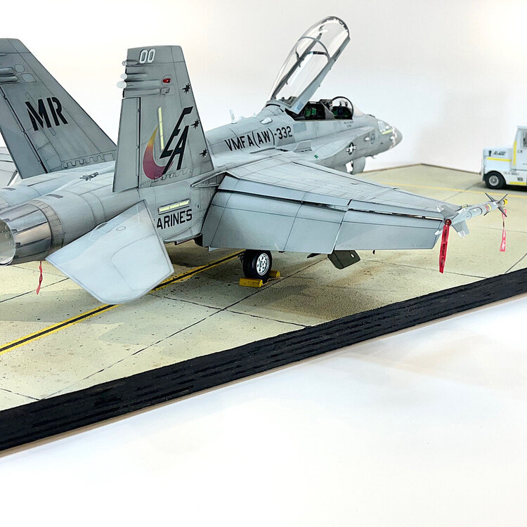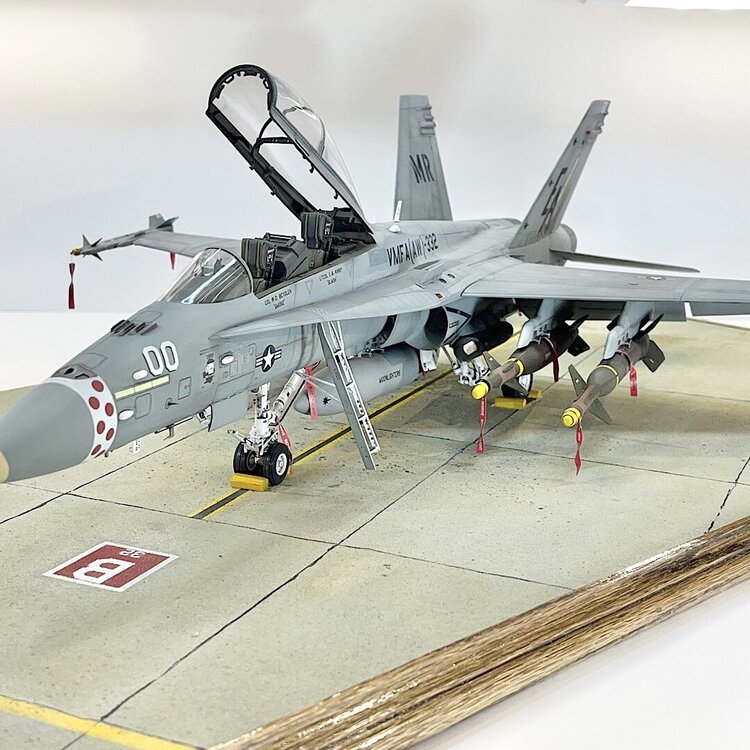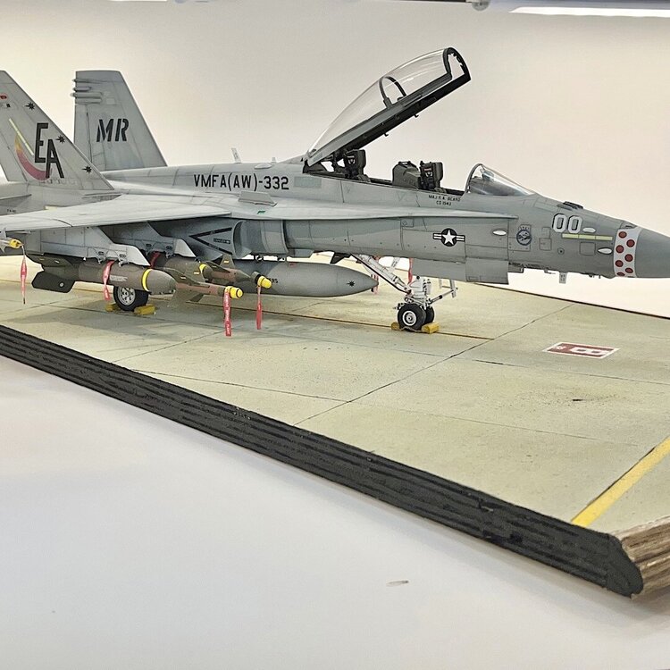 1. Well, she rolled off the assembly line two days ago. As far as I’m concerned, this kit is an excellent build. Designed very well. After the decals were applied, I did a pin wash over all the recessed detail. I wiped off the excess with mineral spirits. The base is 3/4” plywood. To simulate concrete, I cut up squares of 100 grit sandpaper, and attached them with contact cement. Once built, it was airbrushed with several shades of Tamiya gray, and tan. To add oil and grease stains, I splattered Tamiya accent colors with a large brush. I taped and sprayed Tamiya yellow and black to simulate the lines. I decided at the last moment to add an aircraft tug from Aerobonus. The remove before flight tags are from Eduard. I had to scratch build the optical covers for the GBU-24’s, and GBU-10’s. Chris
