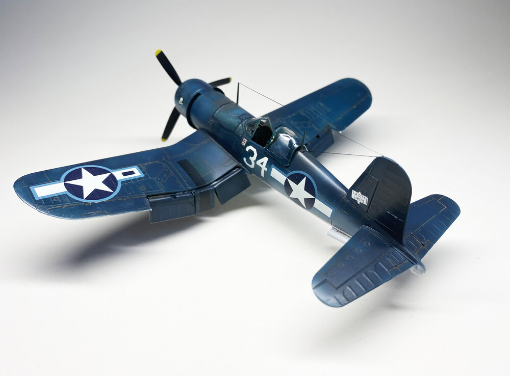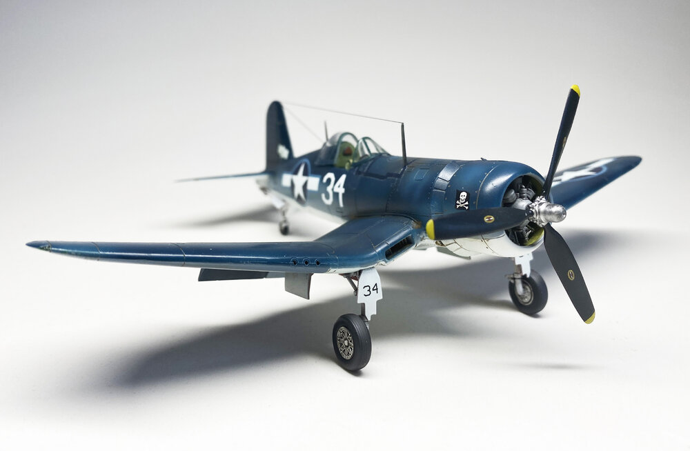 Tamiya 1/72 Chance-Vought F4U-1A Corsair. Piloted by LT(jg) Doris "Chico" Freeman, VF-17 Jolly Rogers. He would claim two victories with VF-17 and an additional seven with VF-84. Improvements include: Quinta Studios Cockpit. Aires Landing Flaps. Ceramic Wire Antenna. Blanked off Trailing Edges. EagleCals decals. The oil tapes and wing walks are Tamiya decals from the kit, and were the worst Tamiya decals I've ever used. Shattered, tore, etc. The oil tapes are silvered around the edges, despite my best efforts. Oh, well...on to the next one.4 points