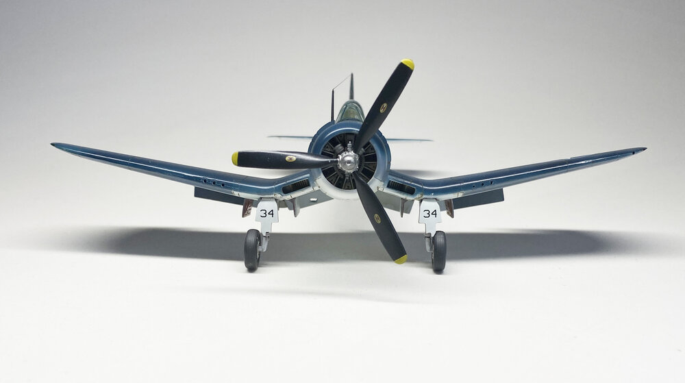 This is the ID/Combat vacuform kit of the EC-121 Constellation built instead as the Connie used by the Blue Angels in the late 1960s. Everything except the basic airframe had to be scratchbuilt or grabbed from spare parts or repurposed aftermarket. There's a complete "in progress" post on building it and its components in the "build" topic area for anyone interested in the gory details. All of the small round windows were made by using UV cured clear resin that was then sanded and polished with a final coat of Future to brighten them. The model was (in the end) painted in Testors Gloss Dark Blue for the BA Blue (I was out of MM BA blue!) and the BA yellow was done using Tamyia rattle can Camel Yellow applied over flat white primer. The bare metal areas on the cowl sides are Alclad Airframe Aluminum while the prop spinners and cowl leading edges were sprayed Alclad Chrome. The Blue Angels markings came from 2 different sheets, BOTH of them 1/32 scale (to allow for the larger 1/48 aircraft lettering); a CAM A-4 BA Skyhawk sheet and a Draw Decals F7U-1 Cutlass Blue Angels sheet. I did, however, make stencils and mask and paint the yellow "8"s on the tail fins. The American flag decals on the center fin are actually ship decals from the spares box! And now on to the rest of the pics! And... just to answer the question "where would you put it'? I have a display case purposely built big enough for such models. The others currently in the case are a 1/48 B-29 and B-50, as well as a 1/32 B-24D, F-86H, and F-84G. Questions, critiques, and comments welcome, as always. Gil6 points