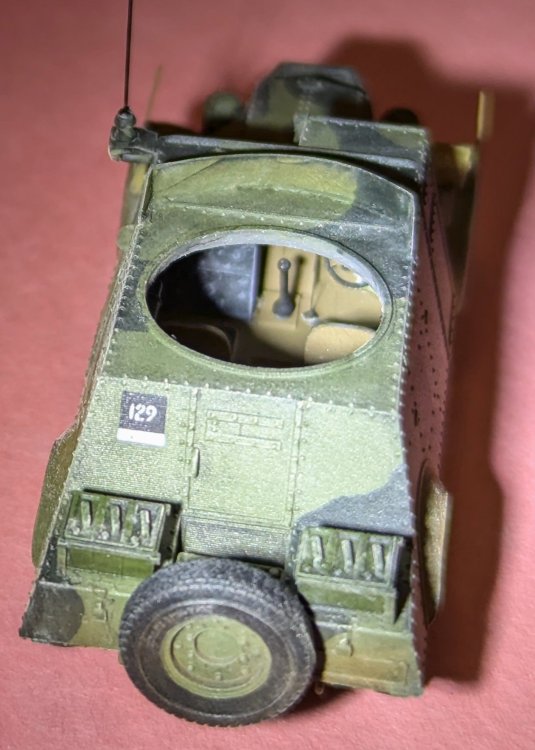 I started this 11 years ago, but my cat got ahold of it and chewed apart the stretched chassis and ate the fuel tanks. The cat is still alive. It started as IBG's 15cwt C15A, and everything behind the spare is scratch-built. The larger wheels came from IBG's Holmes Breakdown kit; details from PART helped dress it up. Decals were pieced together from the Matchbox Monty's caravan, various 1:72 sheets, and the IBG sheet. The unit sign was made by trimming the corners off a Portuguese flag decal, with white "72" numbers swiped from the numbers jungle on the Airfix USAAF Bomber Service set's decal sheet. Something I learned was that, when the Commonwealth forces were ordered to paint the white star on their vehicles prior to the Normandy landings, many Canadian units applied the markings crooked to differentiate themselves from the Americans! (A good website for Canadian vehicle markings is https://www.canadiansoldiers.com/vehicles/markings/vehiclemarkings.htm.) Weathering included everything from oils to MIG pigments. The bed's cover was made from toilet tissue, and the stores in the bed came from Italeri, Academy, Prieser and my own scratch-building. Note the cases of beer back there - since it's a Canadian truck, I'm saying they're Elsinores.4 points