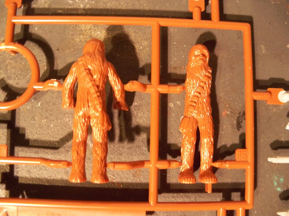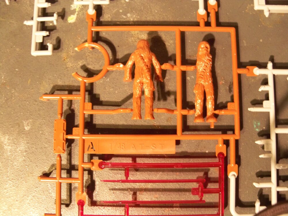 Mark, here are two photos of Chewbacca for you. I found him and he was still in two parts and still on the sprue. Also, I forgot to mention earlier, the AT-ST comes with red laser-fire plastic if the modeler wants to show it in action. It is in one of the photos here still on the sprue below Chewie. -