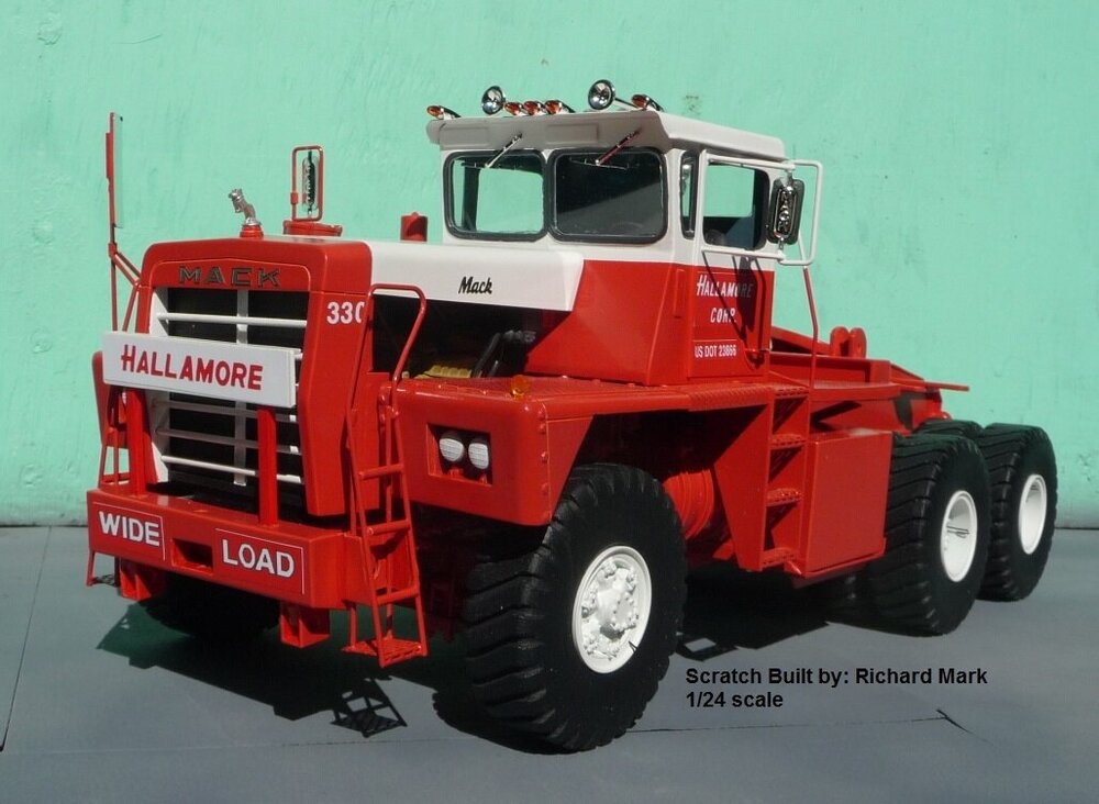 I built this from Mack factory drawings almost 20 years ago, the photos were taken last month. Scratch built primarily in ABS, brass, and resin. Actual unit is one of 2 operated by Hallamore Corporation for heavy haulage. Specs: Cummins VT-1710, Allison CL(B)T-6062 transmission, Mack 150,000 lb. planetary tandem. Fabricated I beam frame sitting on 18:00 x 25 E-3 tires. After compiling all the details, drawings and photos of the actual unit, it took about 7 weeks to build. Included is a photo of the actual truck. Cheers Rick