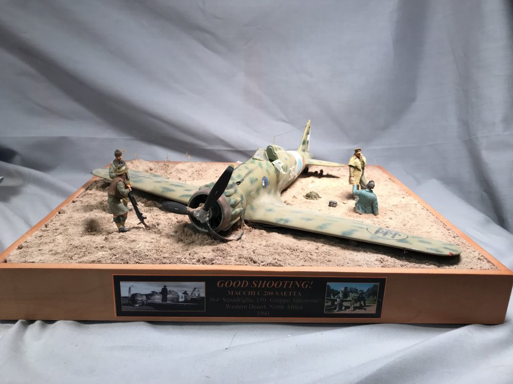 A Macchi C.200 shot down by an LRDG patrol. This is the pacific Coast kit and is really horrid. There is a HUGE gap at the wing roots and the landing gear has a rotten fit. The resin engine needs lots of detail work. D-Day figures. Dak