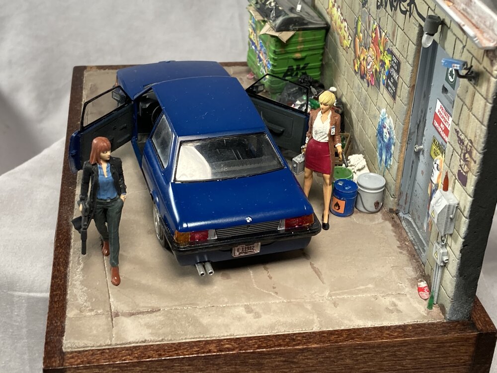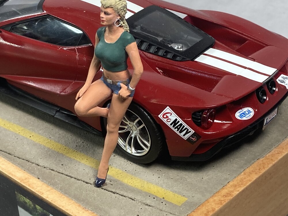 Just finished the Tamiya kit and made some bad mistakes and had a fit problem. Generally, it was a nice kit. The girl is the Mindy kit from Master Box with earrings and a new hairdo. Trust me, the pictures look a lot better than the model. Note the handicap placard. (Yes, the space is marked.) Dak