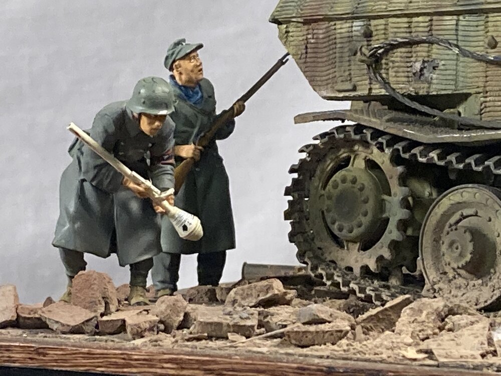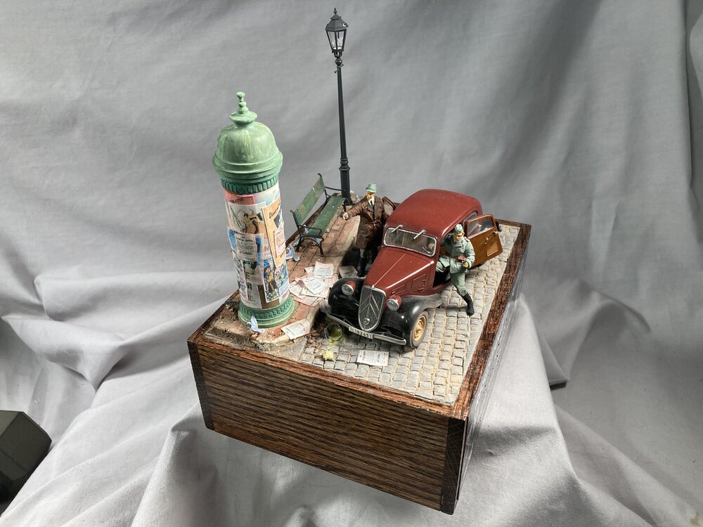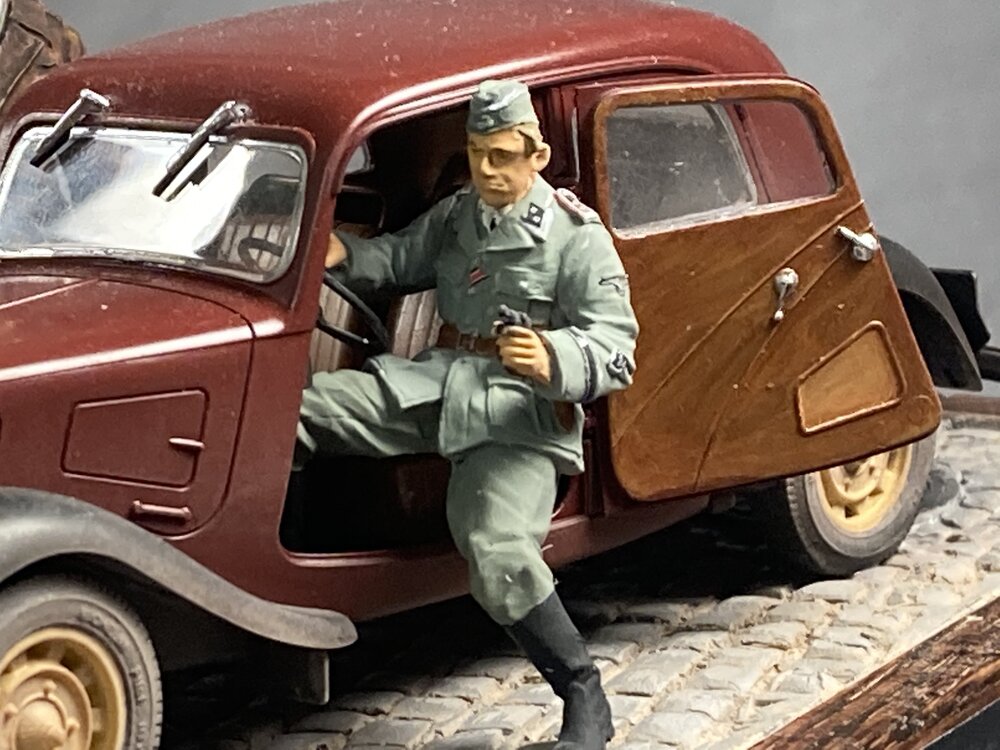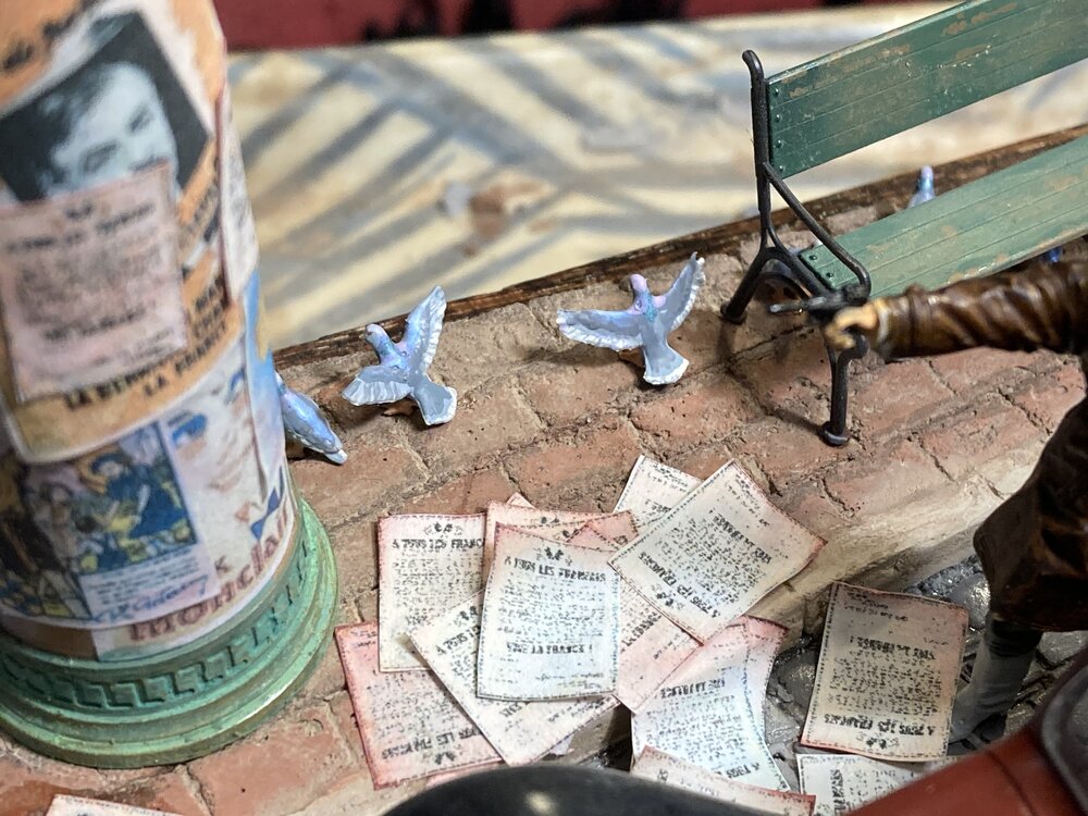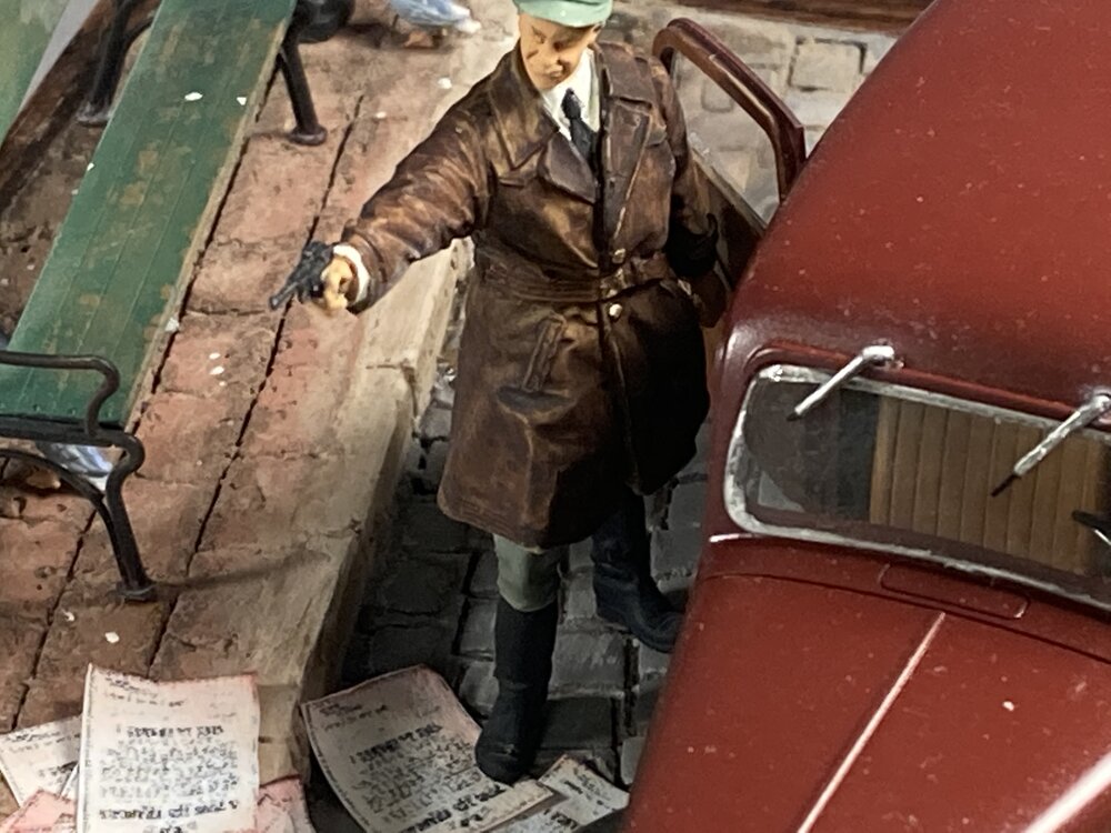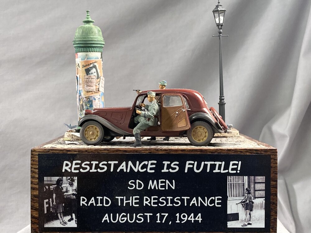 You thought this was going to be a Star trek scene, but it is a pair of Nazi SD guys raiding resistance members putting up posters. The Figures are from D-day, the car Tamiya and the kiosk from Custom Dioramics. The pigeons are Miniart along with the streetlamp and bench. The pavers and sidewalk are all done with grout. The Paris uprising began on August 18th. Dak