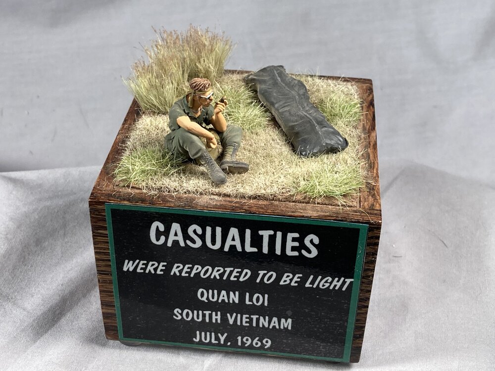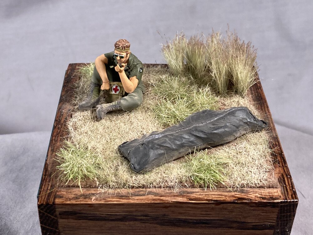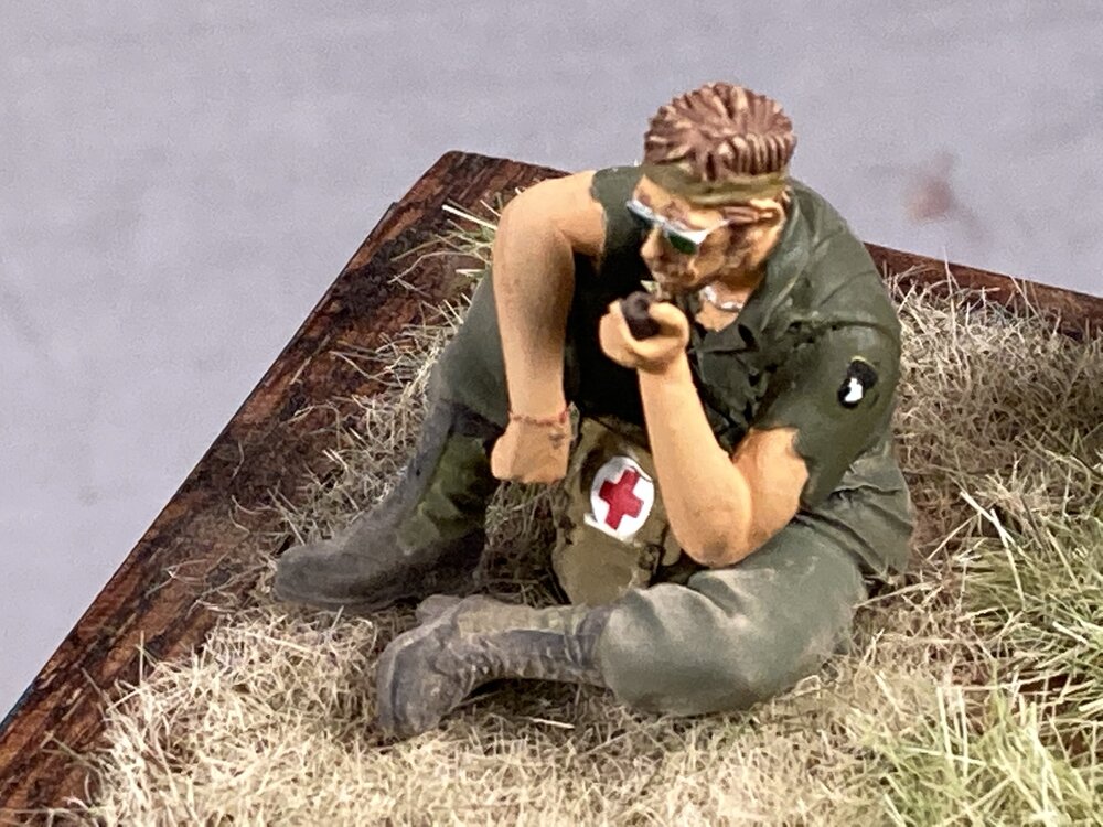 This is an old Verlinden figure and a full body bag from a bootleg maker. The 101st patch came from an old IPMS contest sheet, back in 1982, I think. Painted with enamels. An old friend and former IPMS member, Jerry Taylor, was a medic with the 101st in Vietnam. He was the inspiration for this vignette. Dak