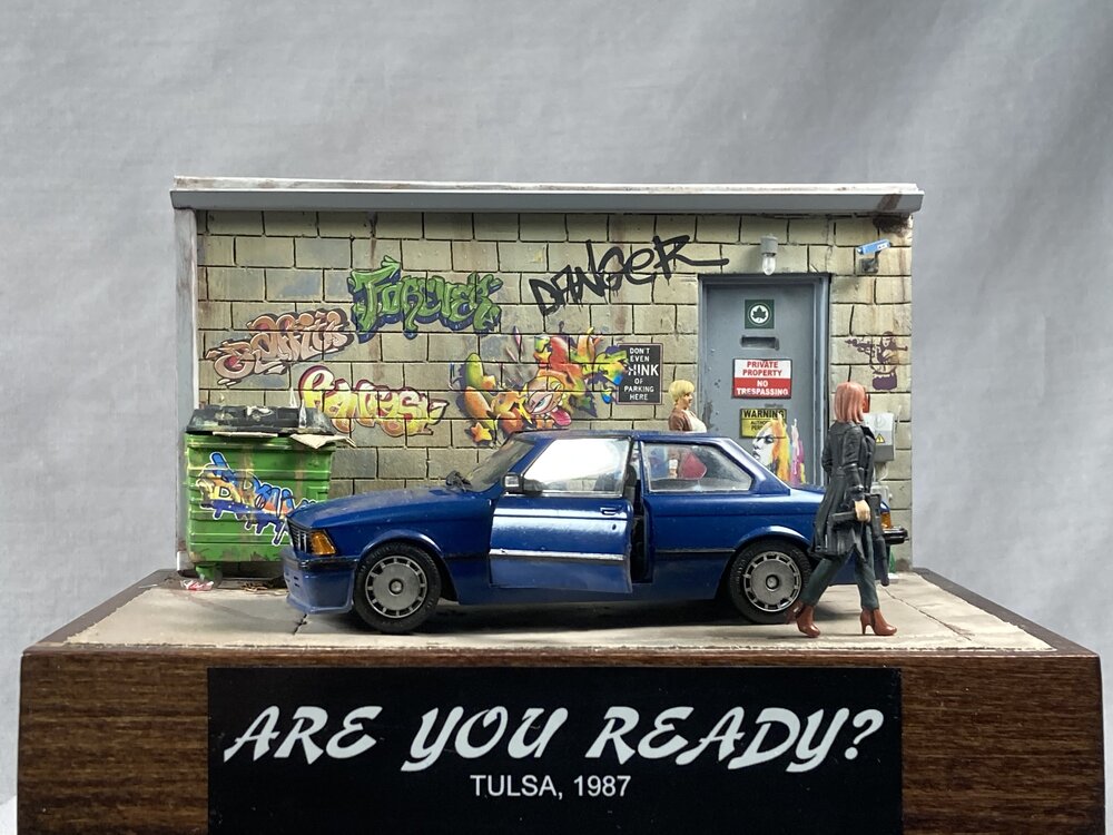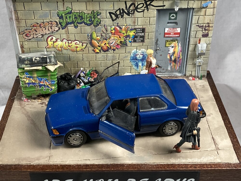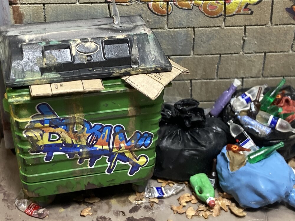 Found these two figures by Nuts Planet and finally figured out where to use them. A back alley in Tulsa, Oklahoma. The wall was made with AK interactive carving foam, the debris came from a variety of sources. The car is from Takom. Graffiti is also from AK. The door is too big. Somewhere along the line, I got careless and switched the Murphy's rule around and accidently used the 1/32nd side when measuring. Well, Duh! Dak